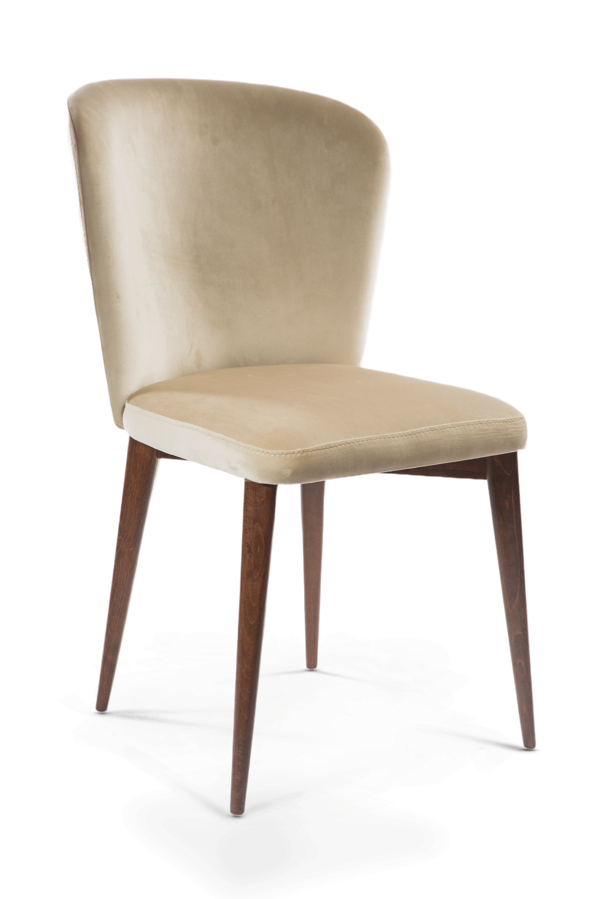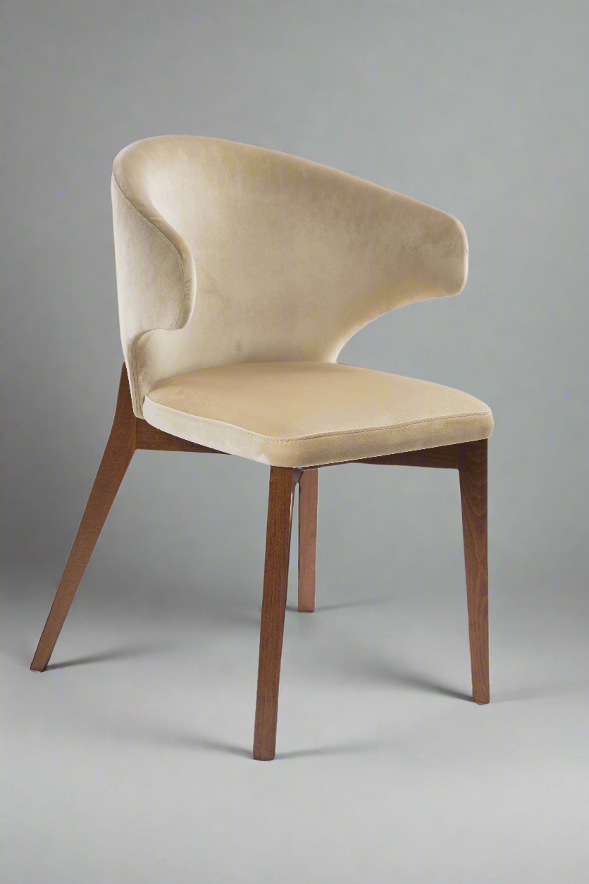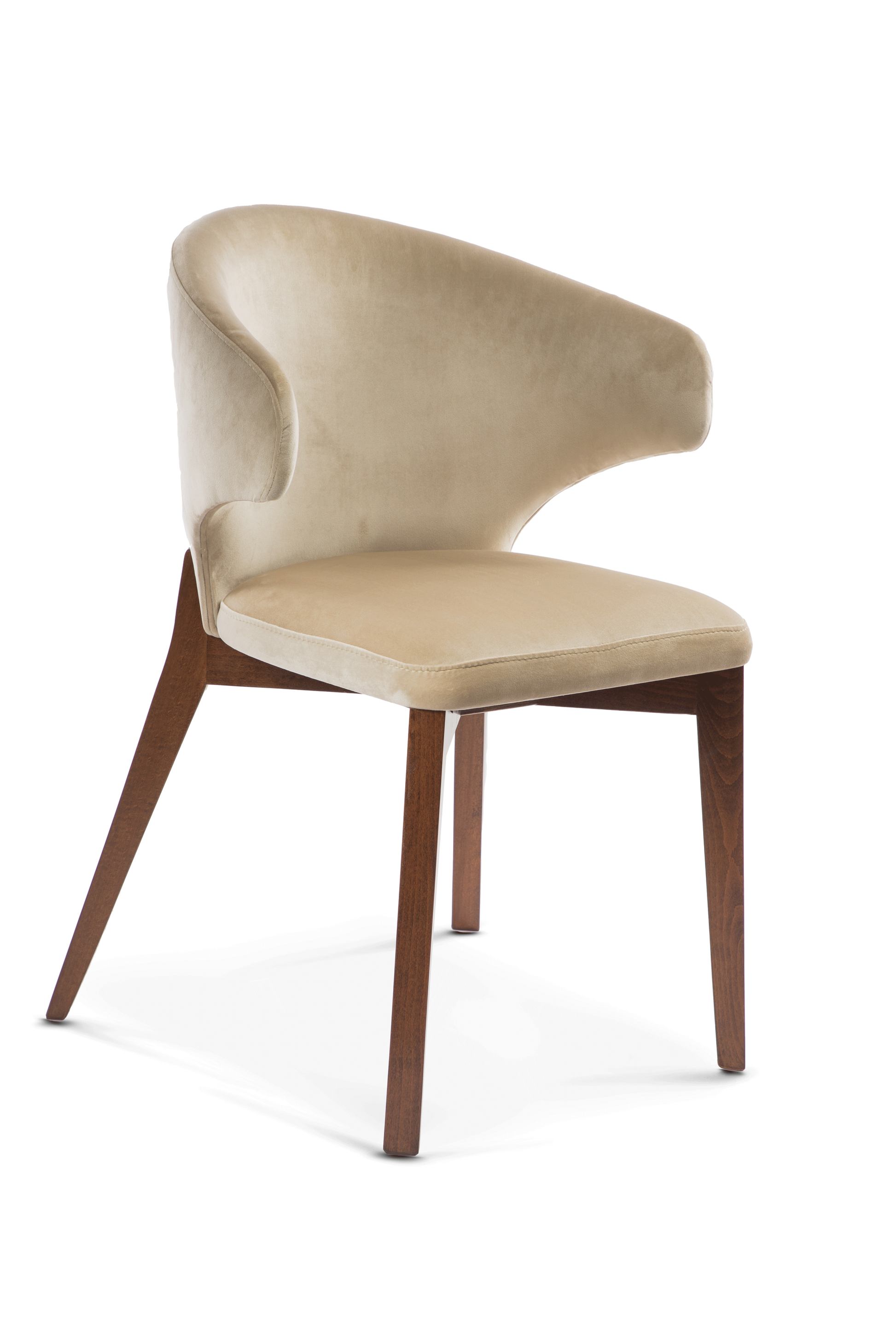 The CATHERINE chair boasts a sturdy wood frame and soft fabric upholstery, available in either beige and dark walnut or white. Crafted with quality materials, it adds a touch of elegance to any space.