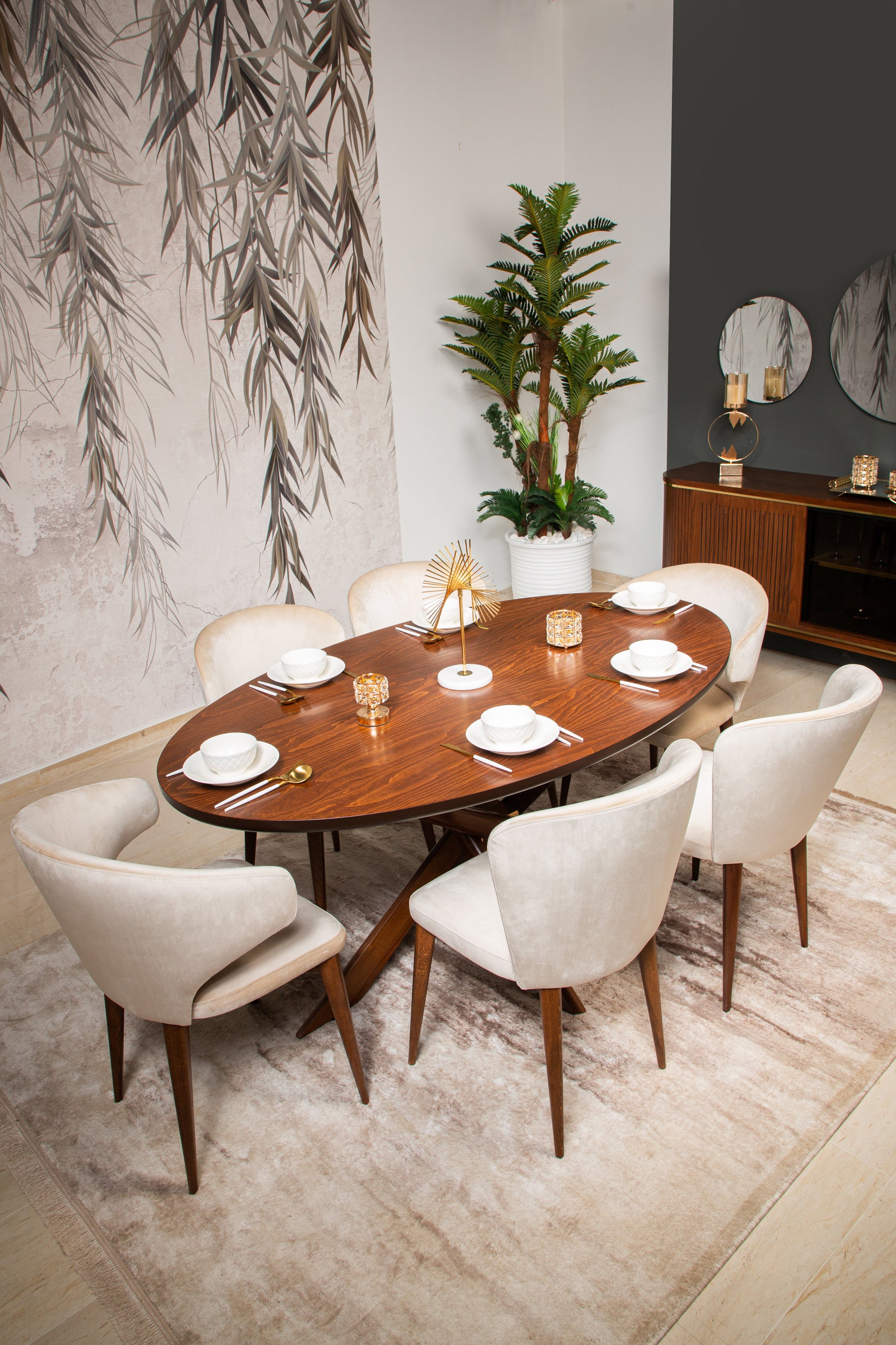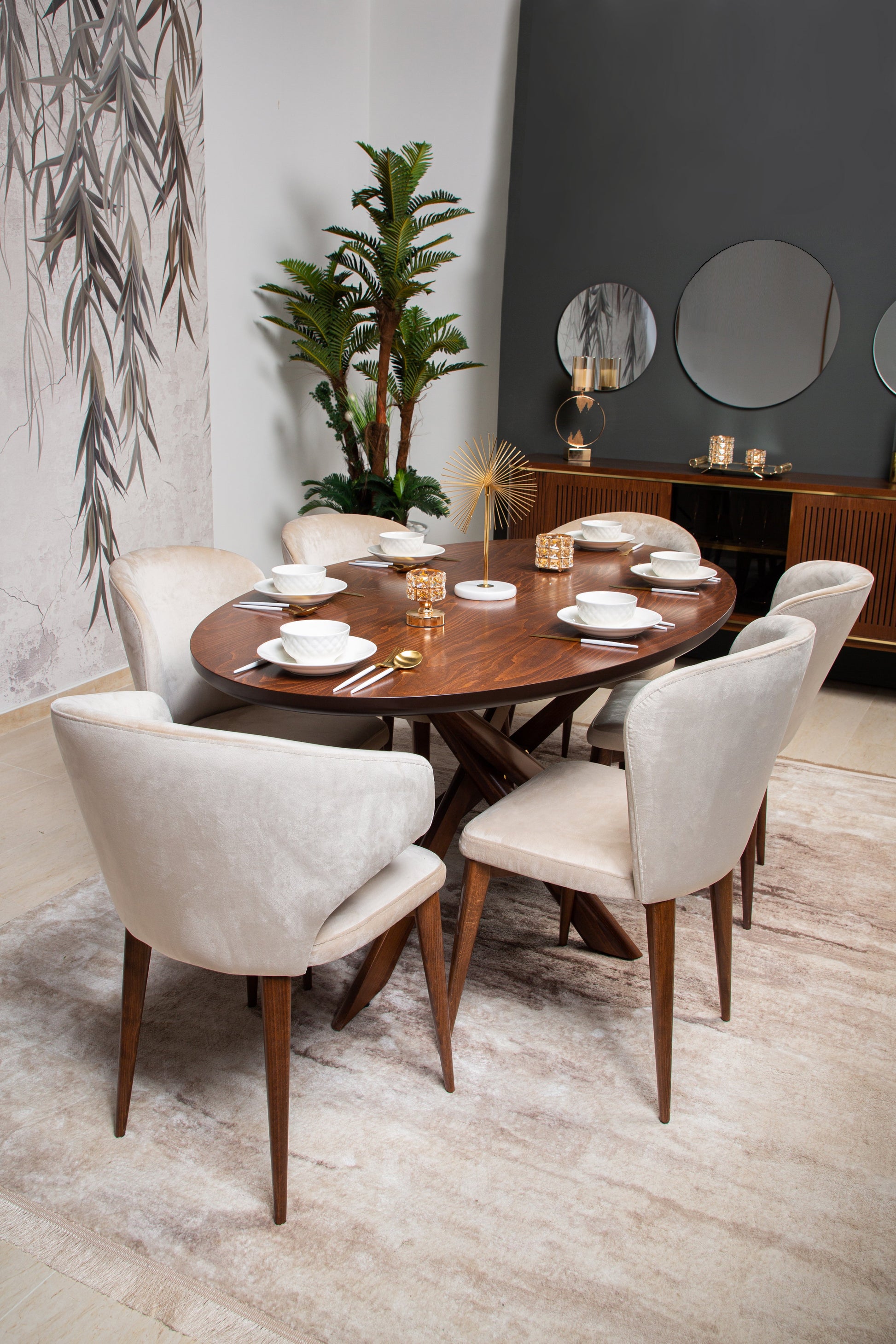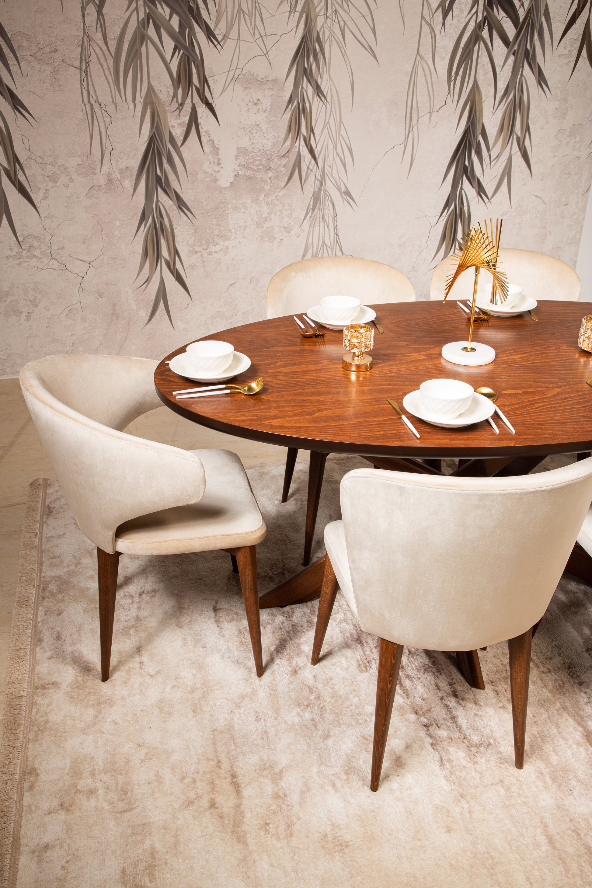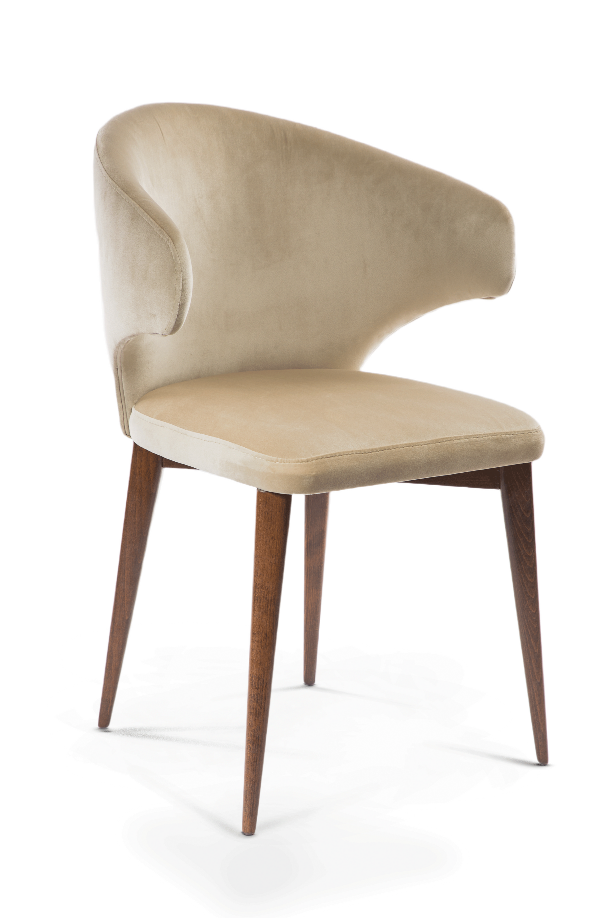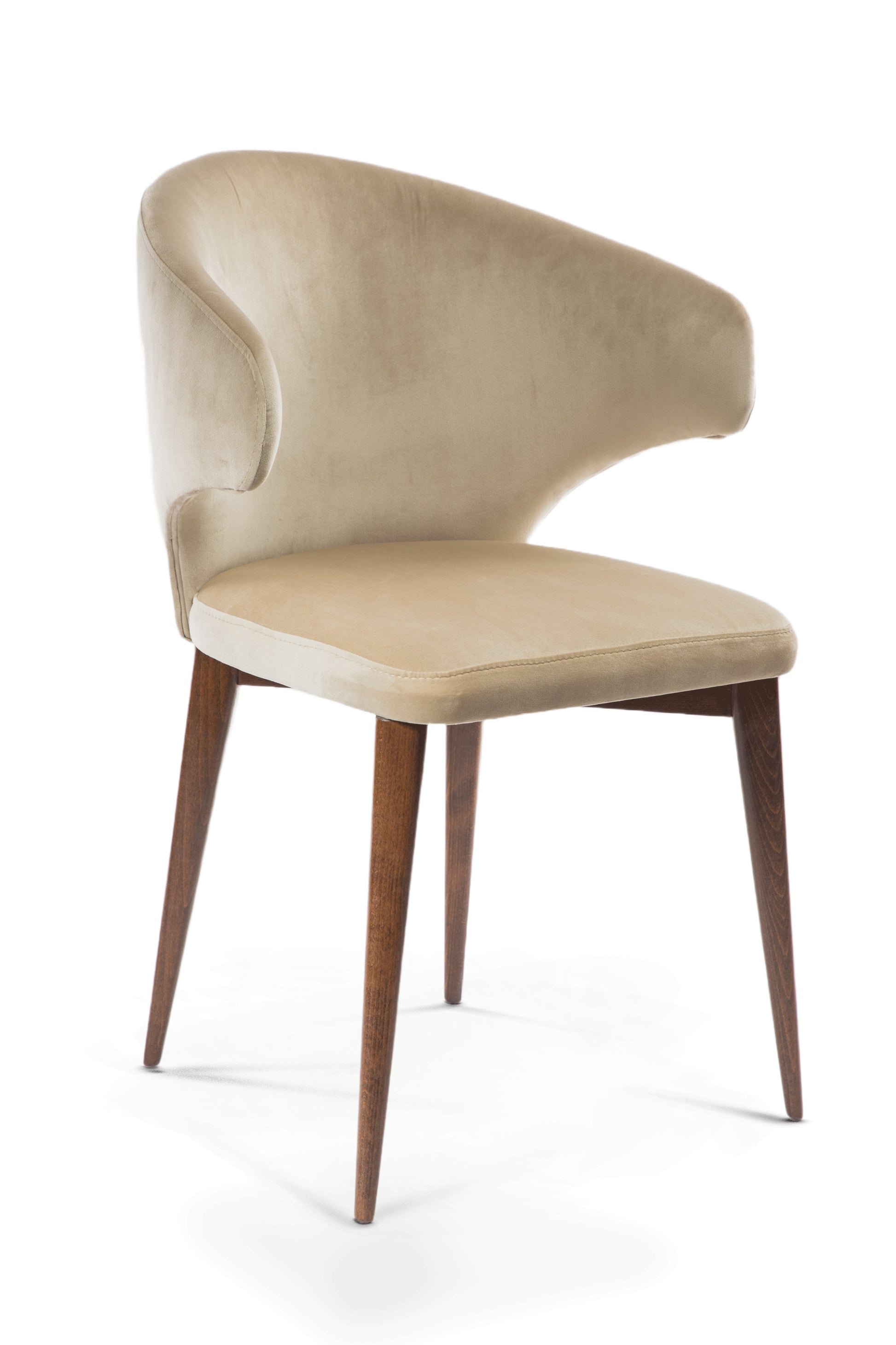 The CATHERINE chair boasts a sturdy wood frame and soft fabric upholstery, available in either beige and dark walnut or white. Crafted with quality materials, it adds a touch of elegance to any space.