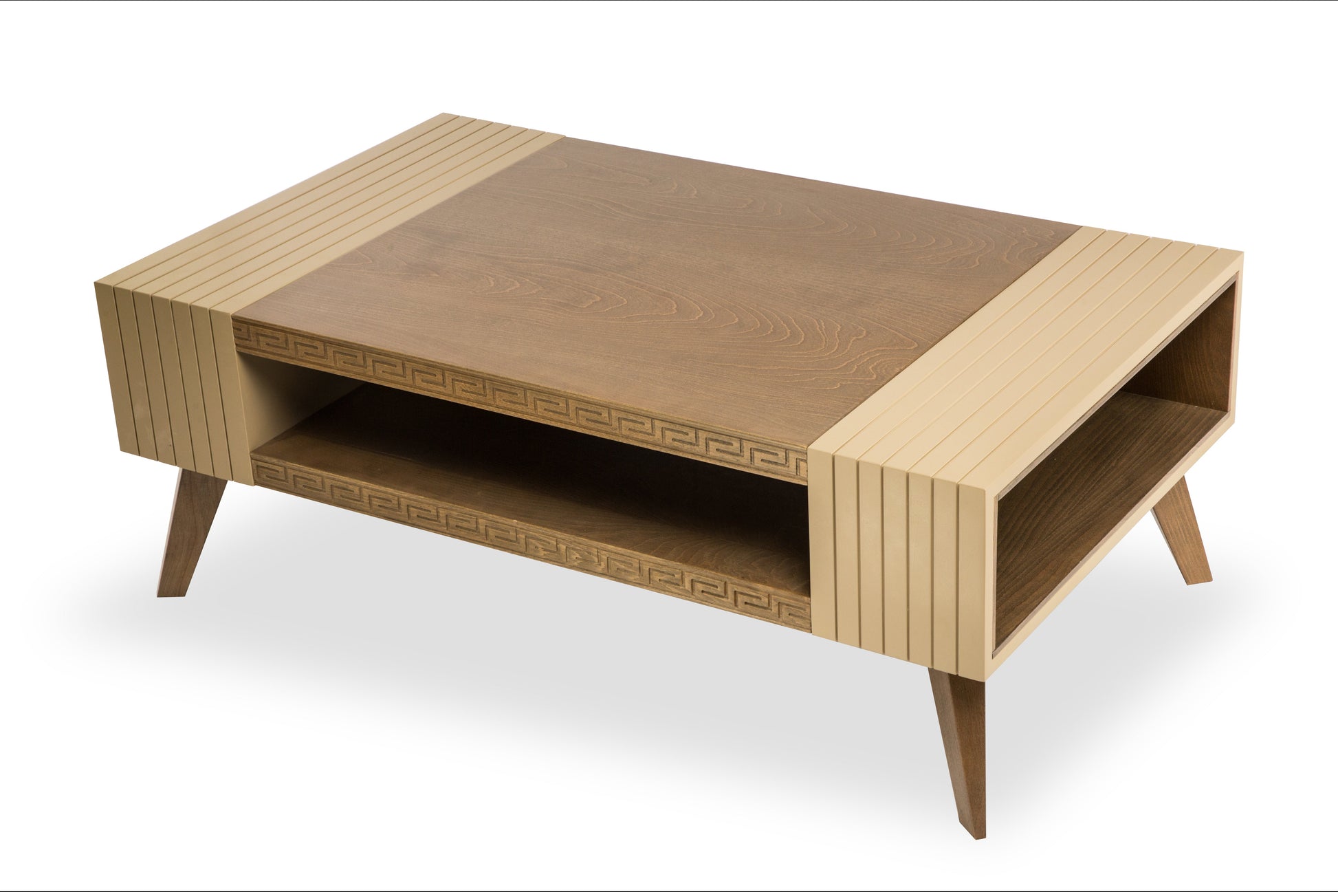 Introducing the DIOR Coffee Table, expertly crafted from high-quality wood in a beautiful beige and dark walnut color. This table brings both elegance and warmth to your living space. Handmade with precision and quality materials for a lasting addition to your home.