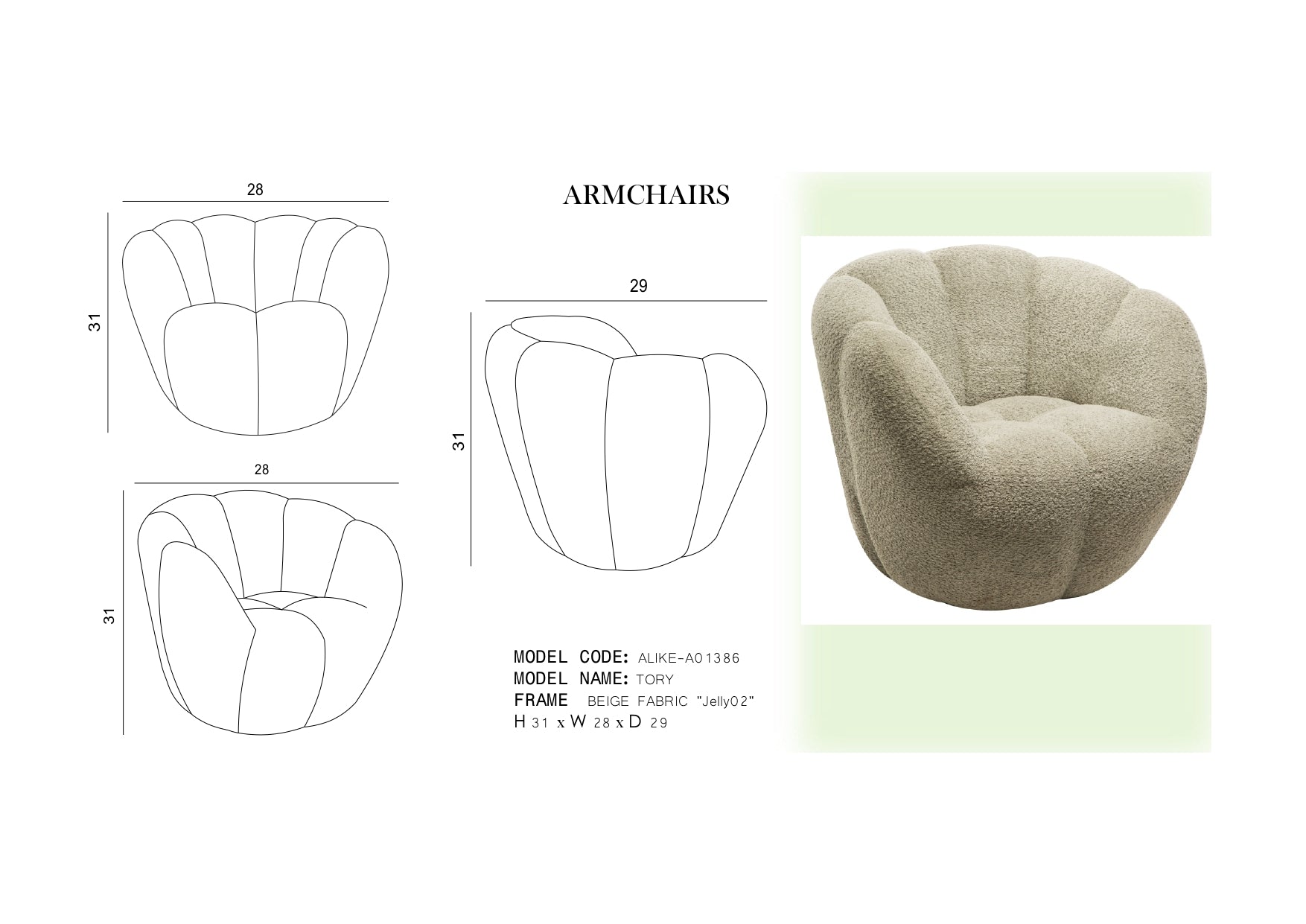 The TORY armchair measures 28 × 29 × 31 inches, offering a comfortable and well-proportioned seating option. Crafted from quality wood and upholstered in beige fabric, it combines durability with a neutral aesthetic that complements various interiors. Weighing 26.4 LB, this armchair is sturdy yet manageable for repositioning. Its thoughtful design and materials ensure both comfort and longevity, making it a refined choice for expert-level furniture selection.