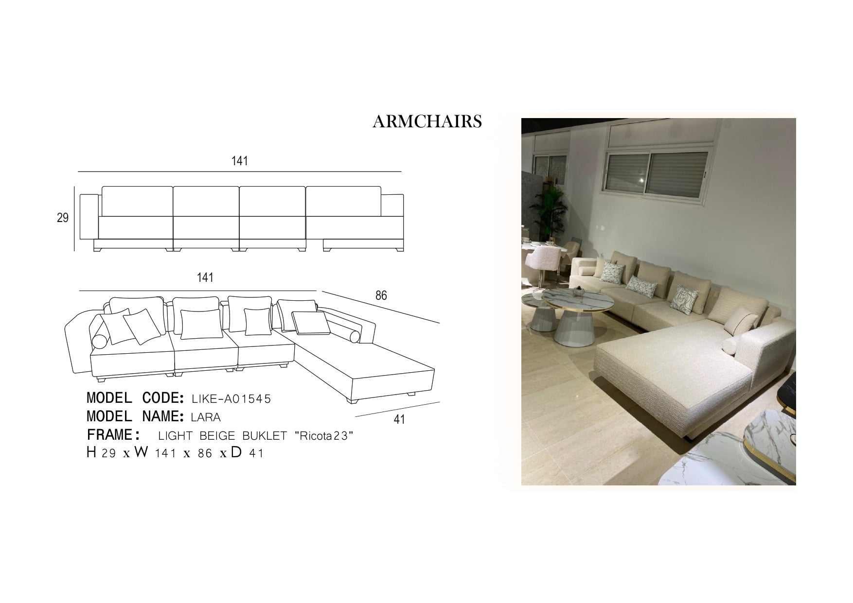 The LARA set features three pieces crafted from quality wood and fabric, combining durability with refined aesthetics. The main piece measures 141 × 86 × 41 × (H)29 inches, offering ample space and comfort. Finished in a sophisticated light beige and gray palette, it complements a variety of interior styles. Weighing 286.6 LB, this collection balances sturdy construction with elegant design, making it a reliable and stylish addition to your living space.