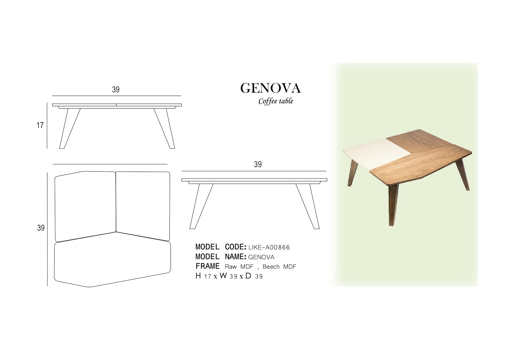 The GENOVA table is expertly crafted from high-quality wood finished in a warm light walnut tone. It measures (39 x 39 x 17 inches), offering a spacious surface with a balanced height for versatile use. Weighing41.8 lbs , this piece combines sturdy construction with elegant design, making it a refined addition to any interior setting.