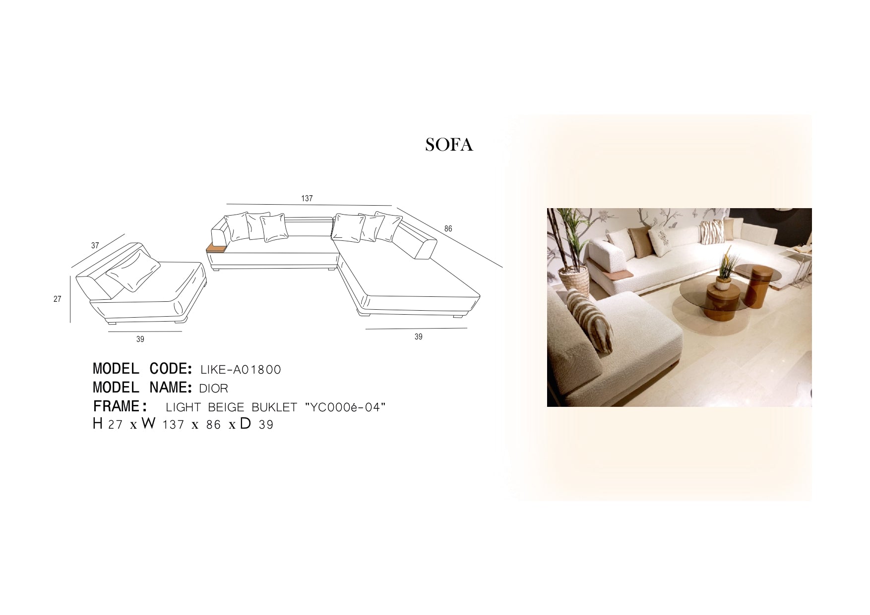 The DIOR sofa combines expert craftsmanship with elegant design, featuring dimensions of 137 × 86 × 39 × (H)27 inches, providing ample seating space. Constructed from high-quality wood and fabric, it offers durability and comfort. Weighing 390.2 LB, this piece ensures stability and longevity. Its light beige color adds a sophisticated, neutral touch that complements various interior styles. Ideal for those seeking a refined and sturdy seating solution.