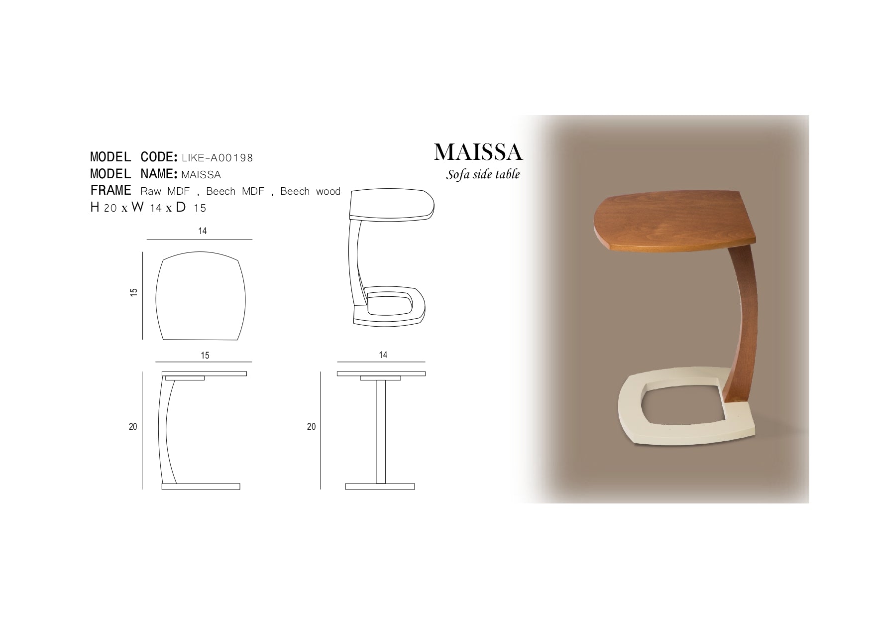 The MAISSA table features a compact design measuring 14 x 15 x 20 inches, making it ideal for versatile use in various spaces. Crafted from high-quality wood, it is available in elegant light walnut and dark walnut finishes, combining durability with refined aesthetics. Weighing 8.8 lbs , this piece offers both stability and ease of movement, suitable for expert-level interior arrangements.