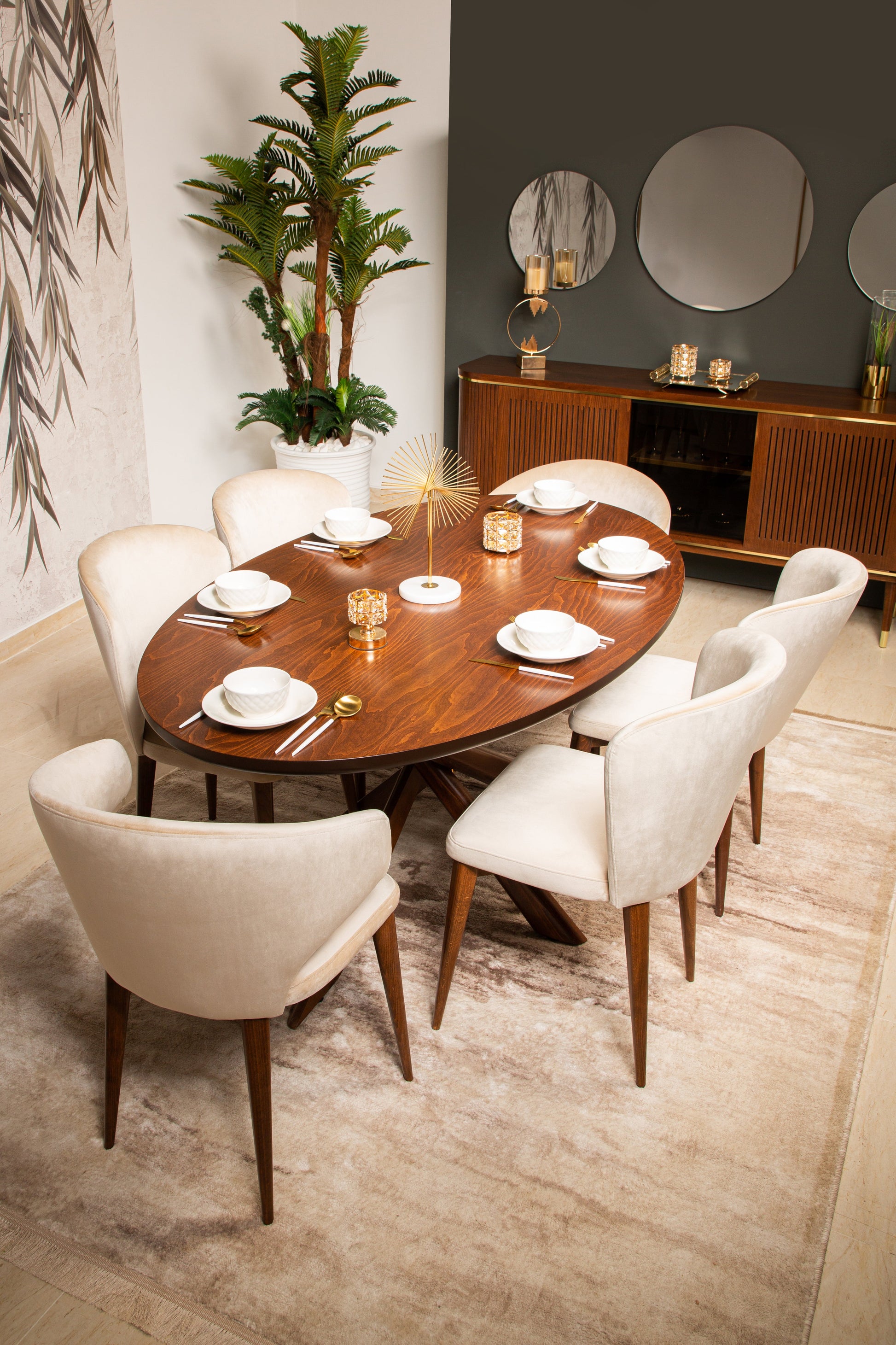 The OVAL Dining Table measures 69 × 35 × 31 inches, offering ample surface area for comfortable dining. Crafted from wood with a dark walnut finish, it combines durability with a rich, elegant appearance. Weighing 59.5 pounds, this table balances sturdy construction with manageable weight for easier placement. Its refined design and quality materials make it a sophisticated centerpiece for any dining space.