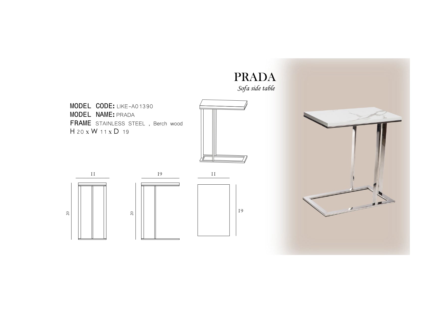 The PRADA table measures 19 inches in depth, 11 inches in width, and 20 inches in height, weighing 8.8 pounds. Crafted from a combination of metal, glass, and wood, it features a silver finish complemented by light walnut or marble surfaces in black or white. This piece offers a refined balance of materials and colors, delivering both durability and sophisticated style suitable for contemporary spaces.