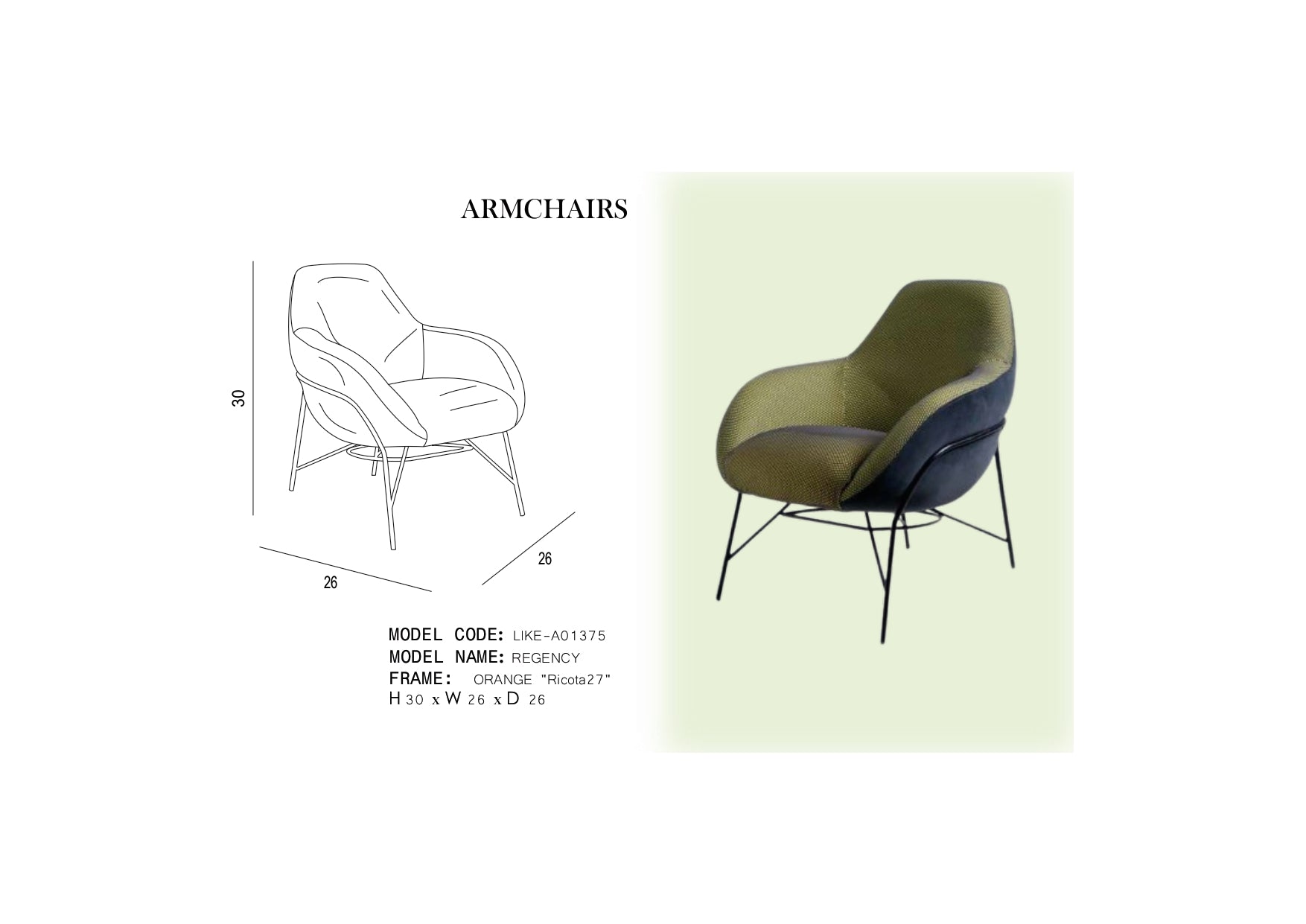 The REGENCY armchair measures 26 × 26 × 30 inches, offering a balanced size suitable for various spaces. Weighing 26.5 LB, it combines sturdy wood and metal with comfortable fabric upholstery. Its striking orange and black color scheme adds a modern, sophisticated touch to any interior. Designed with quality materials, this armchair ensures durability and style for expert-level comfort and aesthetic appeal.
